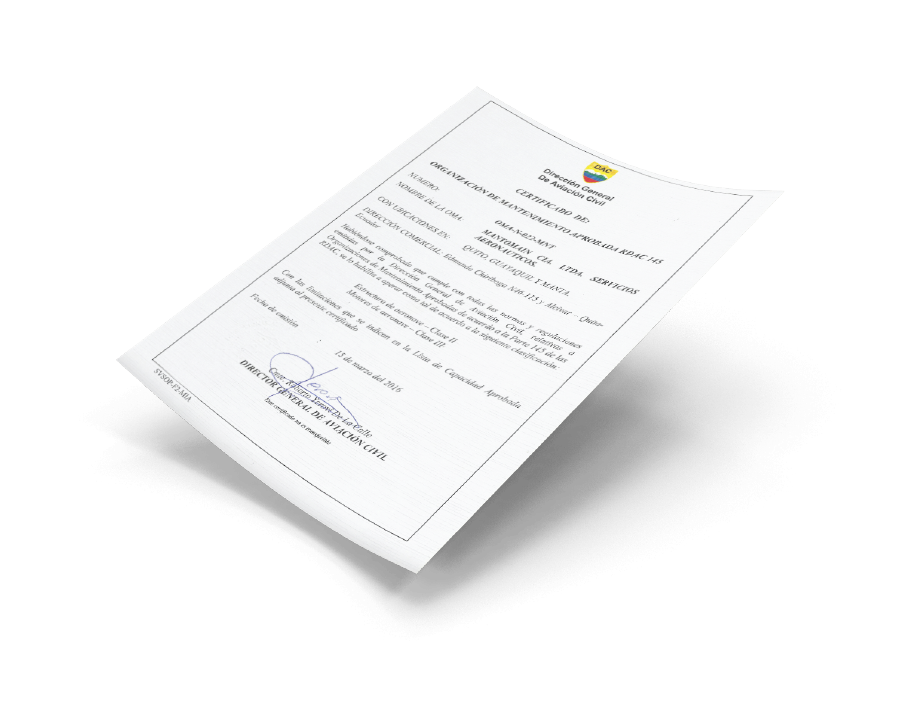 MANTOMAIN is currently certified as RDAC145 Approved Maintenance Organization No. OMA-N-022-MNT to provide Aeronautical Maintenance Services on the Flight Line, complying with the maintenance policies of our customers and with the regulations of the Ecuadorian Aeronautical Authority and the respective Aeronautical Authorities worldwide.